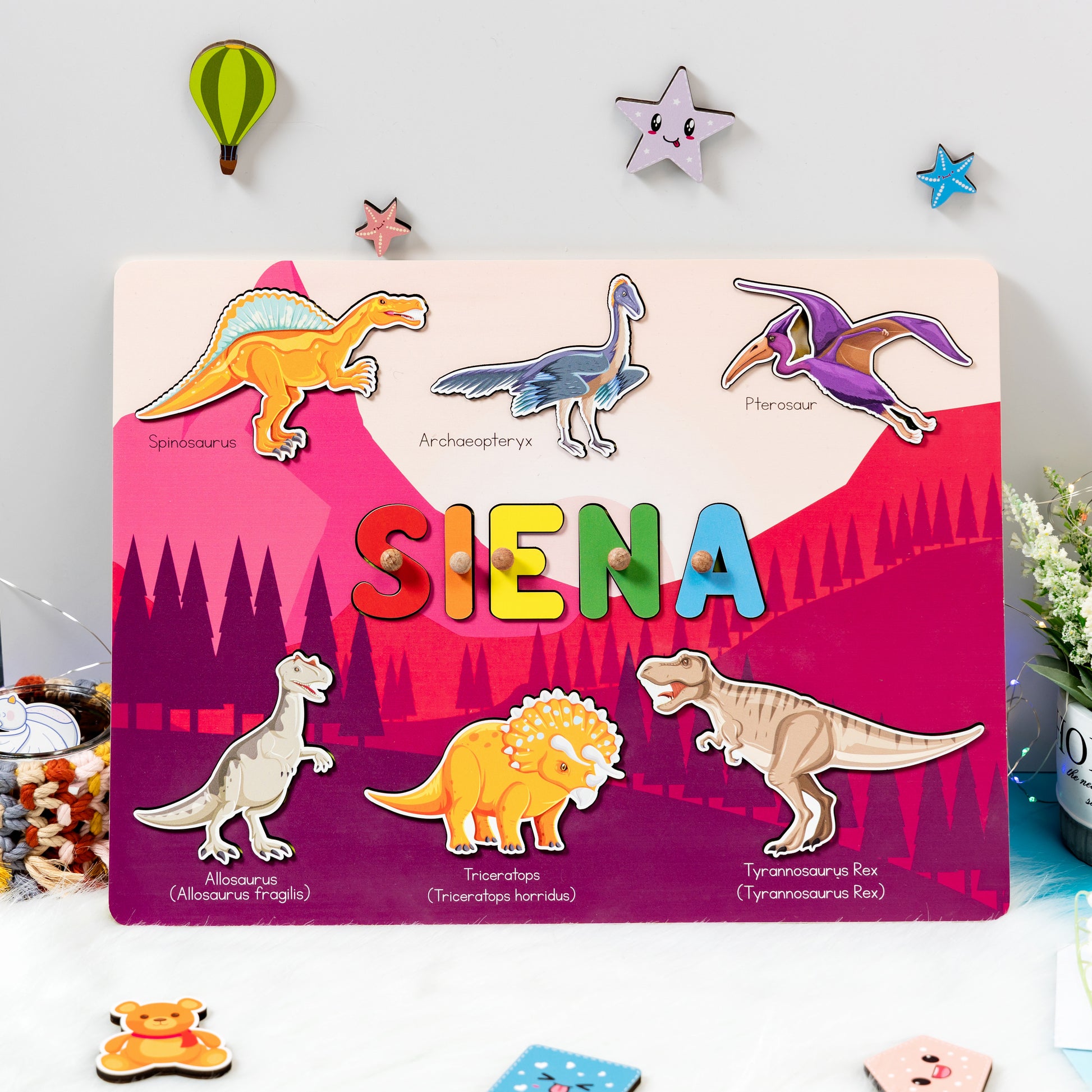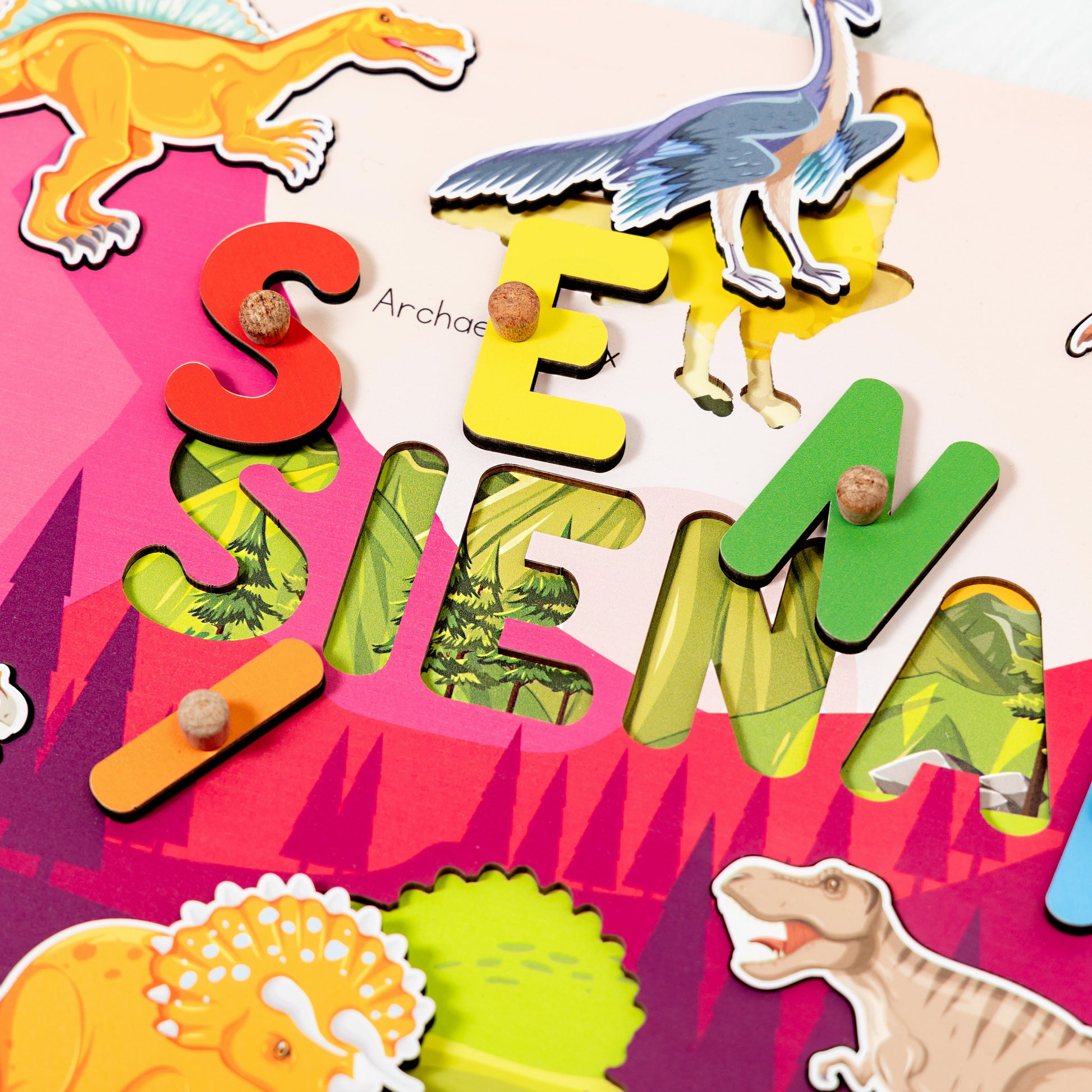 🦖🌿🧩 Step back in time with our Personalized Baby Tyrannosaurus Wooden Name Puzzle. This dinosaur-themed puzzle is a hit for young prehistoric adventurers, featuring letters each uniquely styled with Tyrannosaurus and other dinosaur motifs. The pieces are expertly crafted, showcasing a palette of earthy colors and detailed designs that bring the thrilling world of dinosaurs to life.